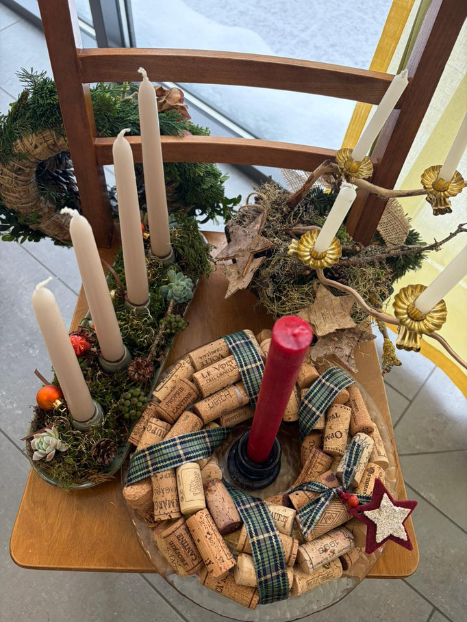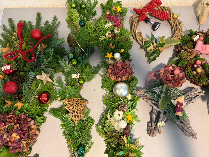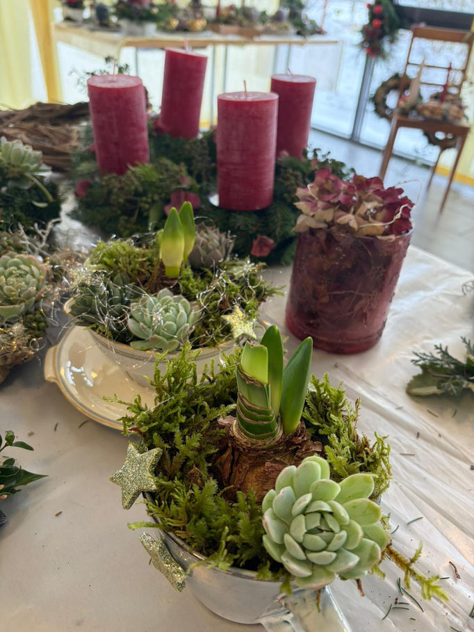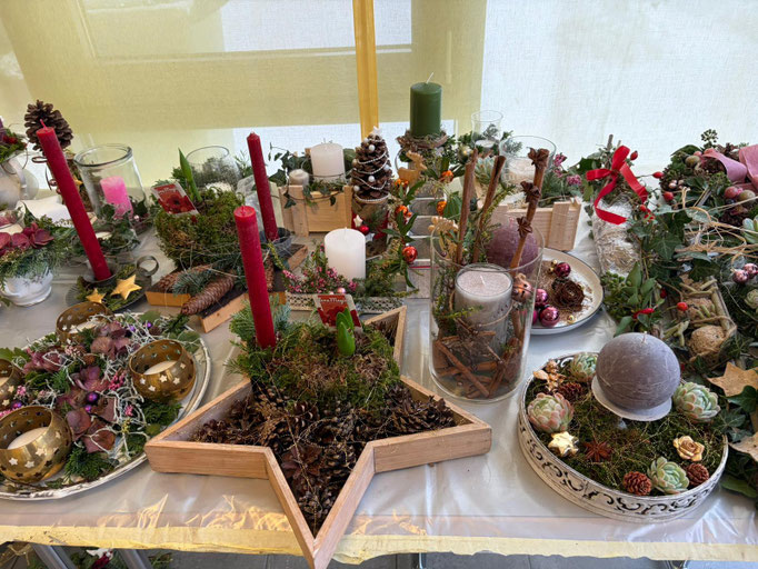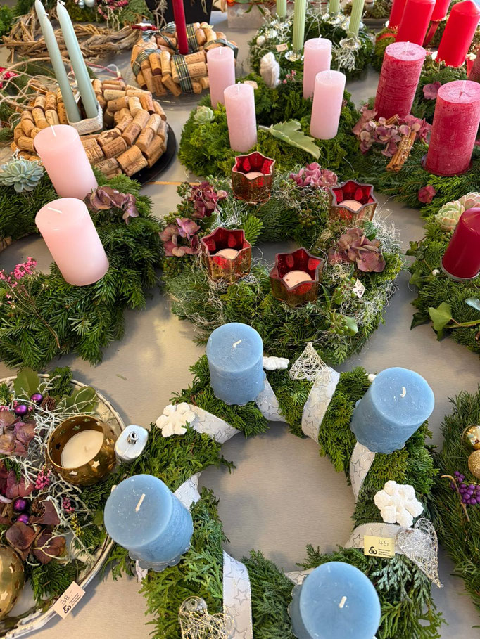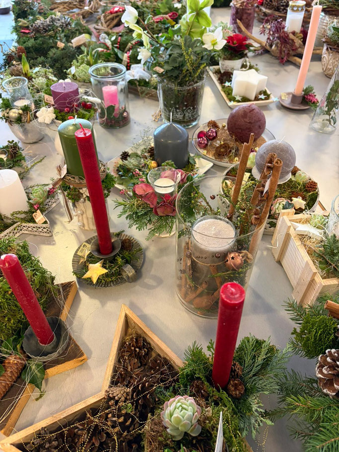 Mit viel Tannengrün, Naturmaterialien und liebevoll ausgewählten Dekomaterialien sind unzählige Kränze, Gestecke und kleine Hingucker für die Adventszeit entstanden. An den Tischen wurde konzentriert gearbeitet, zwischendurch blieb aber immer Zeit für einen Schwatz, ein Lachen und eine Tasse Kaffee.